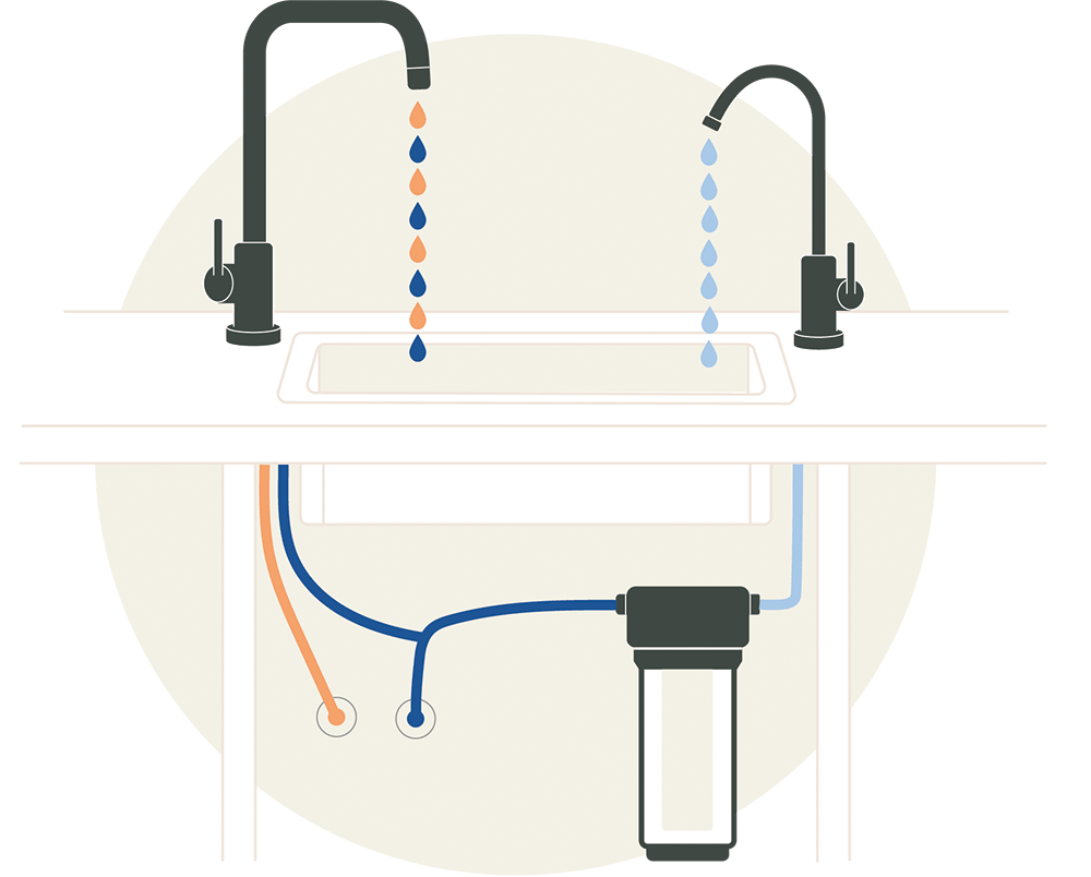 Er wird über ein zusätzliches Loch in der Arbeitsplatte oder Spüle an das Einbaufiltersystem angeschlossen. Für die Montage wird in der Arbeitsplatte / Spüle ein Loch mit Ø 12 mm benötigt.