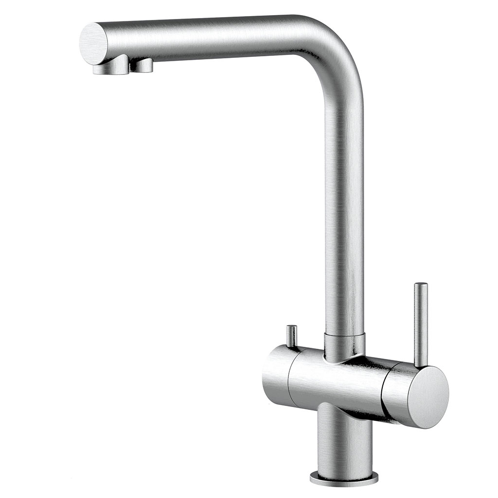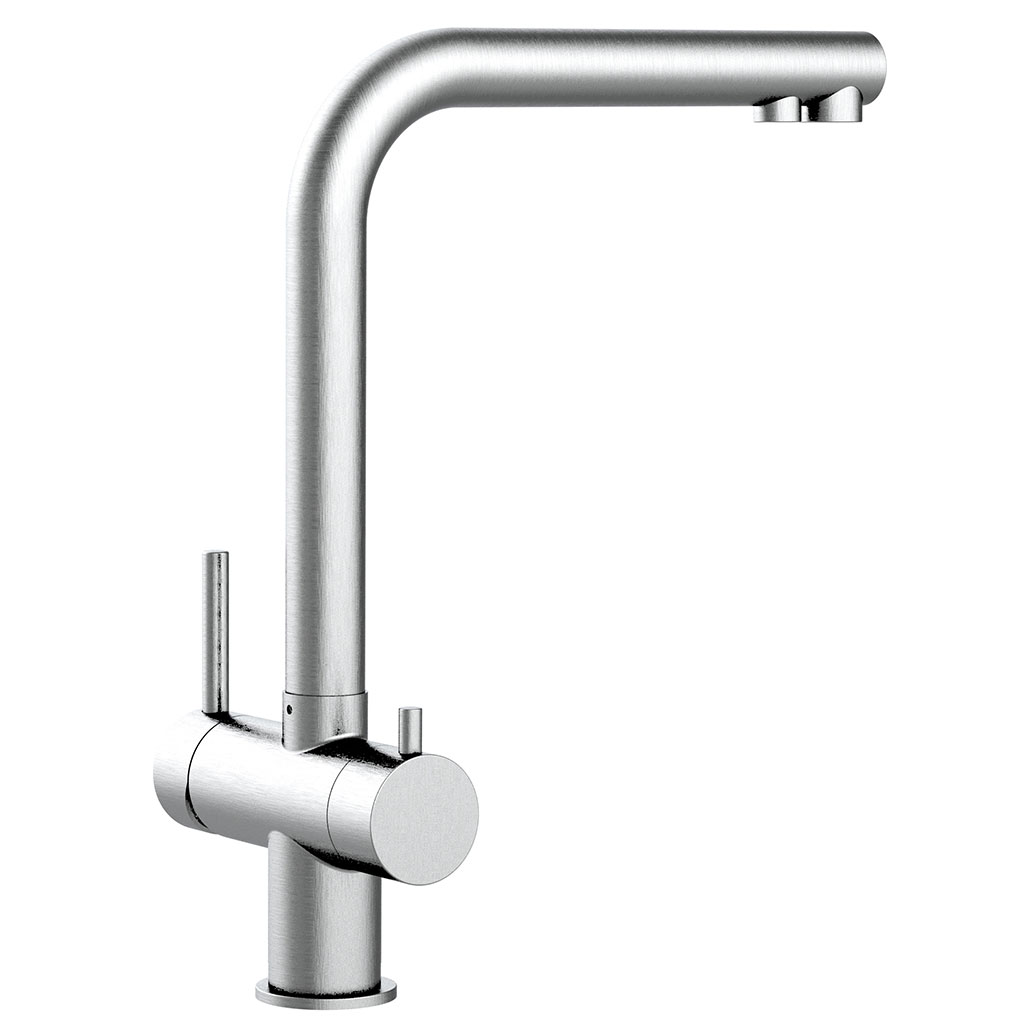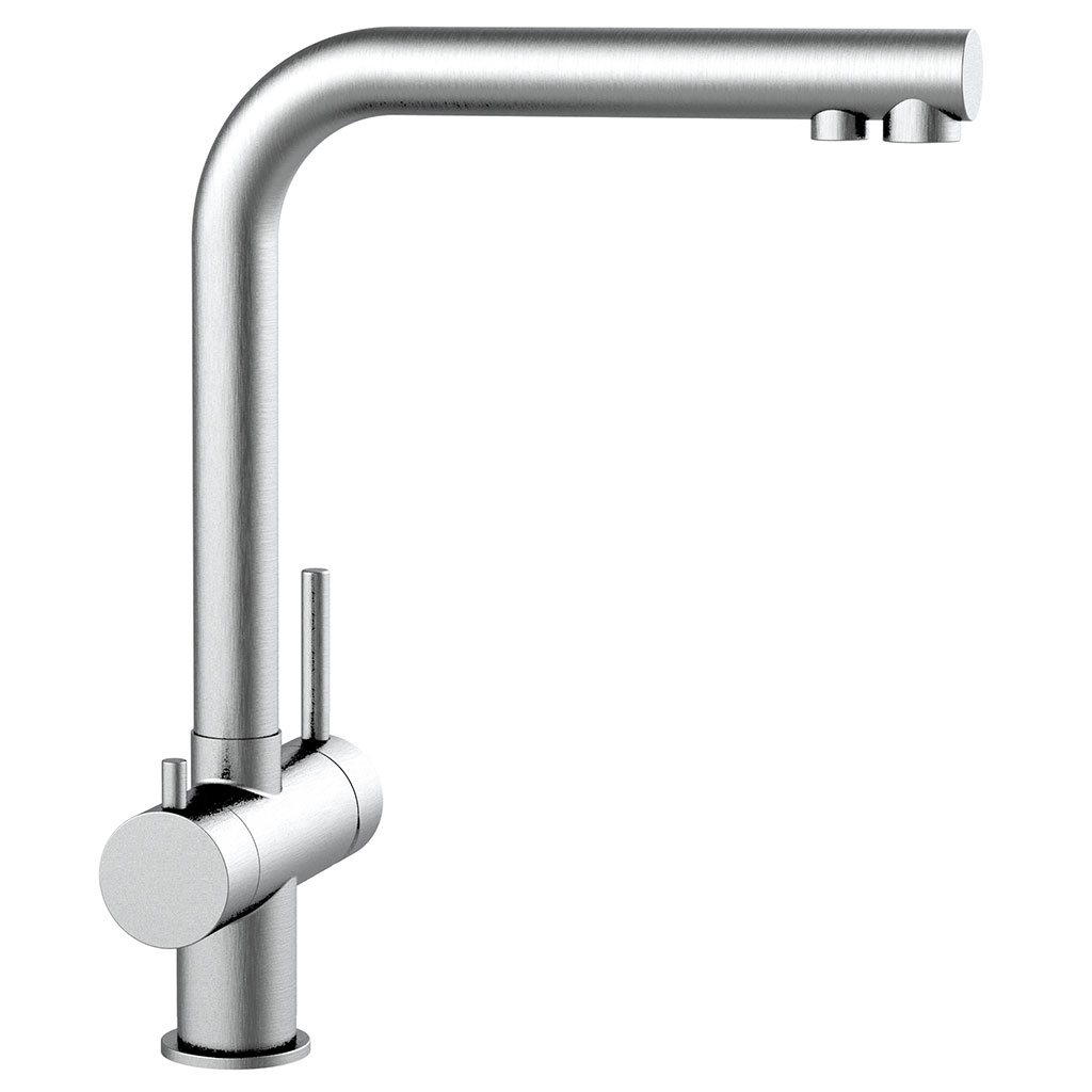Besonderheiten: Auslauf um 360° schwenkbar, aus hochwertigem Edelstahl matt, Fixierset "FIX & LOCK" zur festen Montage auf der Spüle, getrennte Regler und Ausläufe für gefiltertes und ungefiltertes Wasser, Keramik-Kartuschen für eine lange Lebensdauer