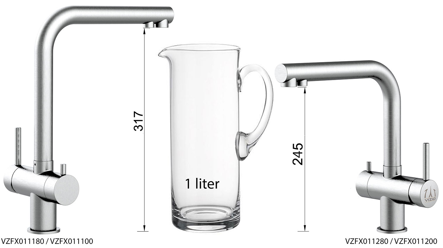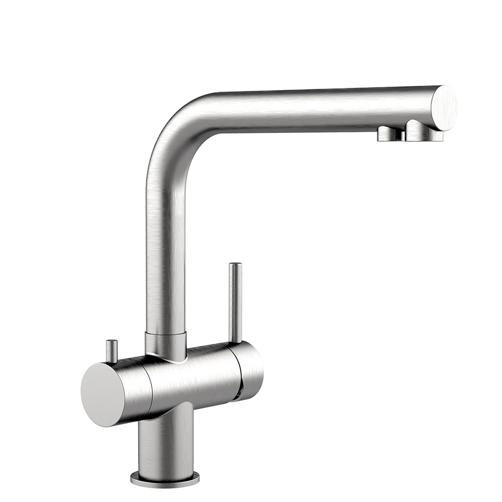 Besonderheiten: Auslauf um 360° schwenkbar, aus hochwertigem Edelstahl matt, Fixierset "FIX & LOCK" zur festen Montage auf der Spüle, getrennte Regler und Ausläufe für gefiltertes und ungefiltertes Wasser, Keramik-Kartuschen für eine lange Lebensdauer