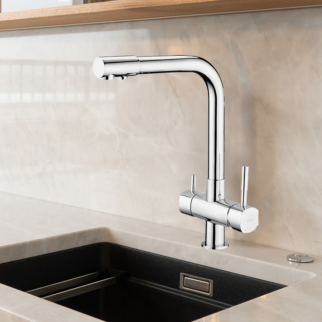 Getrennte Regler und Ausläufe für gefiltertes und ungefiltertes Wasser