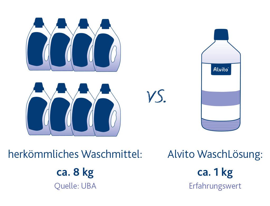 1000ml Alvito Waschlösung reichen bei 4,5 kg Trommelfüllung pro Waschgang für bis zu 100 Waschgänge.