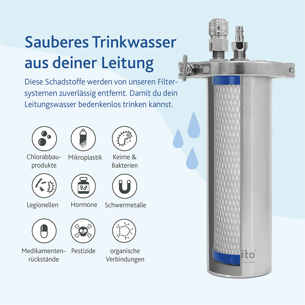 Über die Qualität von gefiltertem Wasser entscheidet der Filtereinsatz. Deshalb wählen wir nur High-End-Blockfilter, die in Deutschland gefertigt werden und eine herausragende, zuverlässige Qualität besitzen.