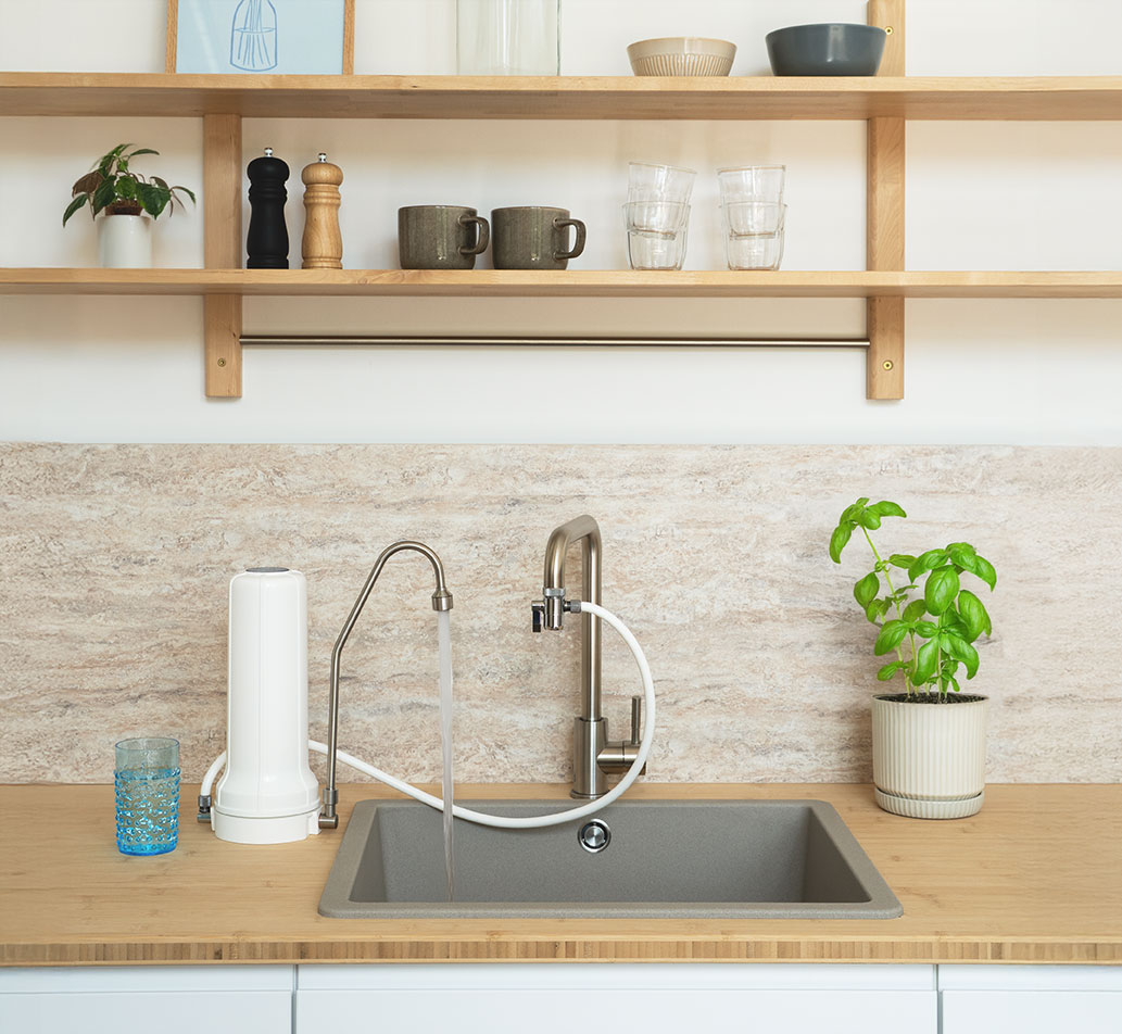 Ausführung: Filtergerät zum Anbau am Wasserhahn auf der Spüle.
