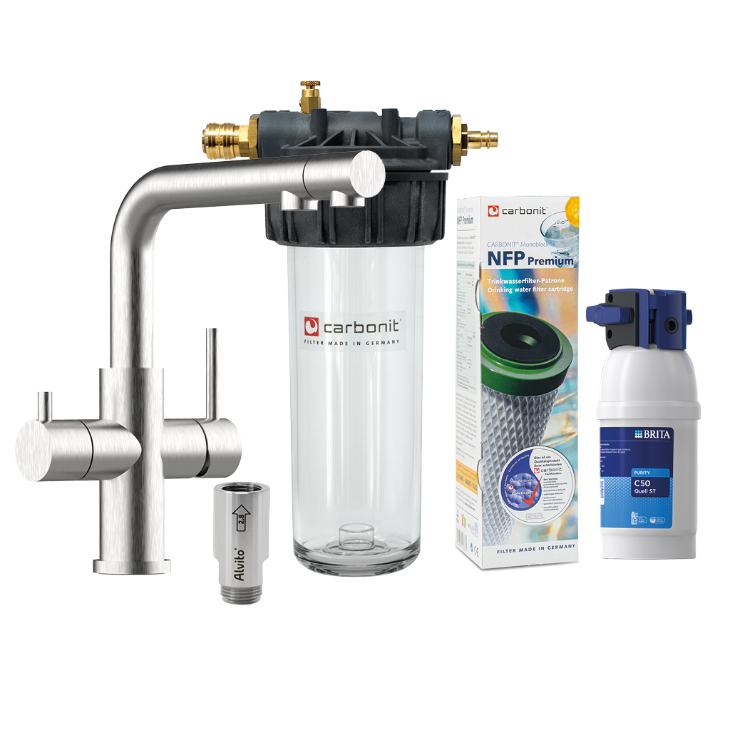 Über die hochwertige 4-Wege-Edelstahl-Armatur Calabro matt lässt sich ungefiltertes Leitungswasser, gefiltertes Wasser sowie gefiltert + enthärtetes Wasser bequem entnehmen.