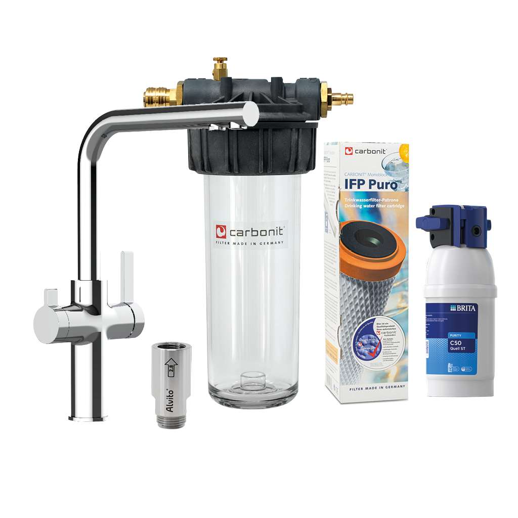 Das System kombiniert die bewährte Carbonit Filtertechnologie mit einer BRITA Enthärtungseinheit und liefert so gefiltertes, enthärtetes und vitalisiertes Trinkwasser direkt aus einer Armatur.